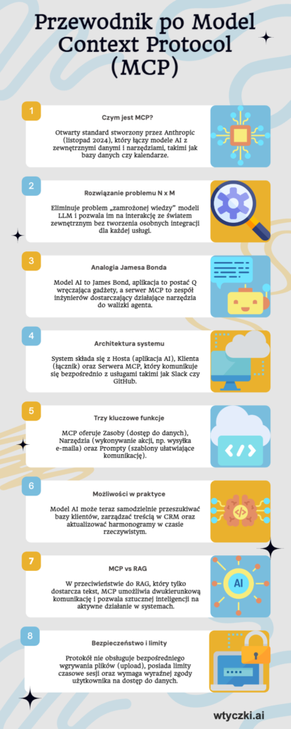Model Context Protocol (MCP) to otwarty standard, który pozwala modelom sztucznej inteligencji (LLM) łączyć się z zewnętrznymi danymi i narzędziami, takimi jak bazy danych, kalendarze czy wewnętrzne systemy firmowe. Został wprowadzony przez firmę Anthropic w listopadzie 2024 roku. Dzięki MCP modele sztucznej inteligencji nie opierają się już wyłącznie na zamrożonej w czasie wiedzy z danych treningowych. Stają się dynamicznymi agentami, które potrafią pobierać aktualne informacje i wykonywać konkretne akcje.